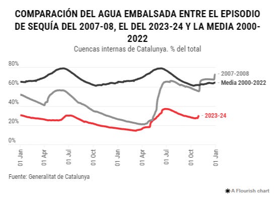 De droogte die de Catalaanse natuur al een aantal jaar in een verstikkende nekklem hield is abrupt geëindigd. Sinds de eerste september is er zo'n 75% van de hoeveelheid regen gevallen die in de twaalf maanden daarvoor voor af en toe een verheugd gilletje onzerzijds had gezorgd. Vanaf januari staat de pluviometro op een whopping 611 millimeter. Bijna die hoeveelheid is in Valencia in slechts een paar uurtjes naar beneden gekomen. De twee stuwmeren die bijna in mijn achtertuin liggen, die van Riudecanyes en Siurana, laten echter nog steeds een treurig laagje water zien dat slechts 1,6% van de capaciteit vertegenwoordigd. Eén zwaluw maakt nog geen zomer en één hoosbui wekt de dode bomen niet opnieuw tot leven.